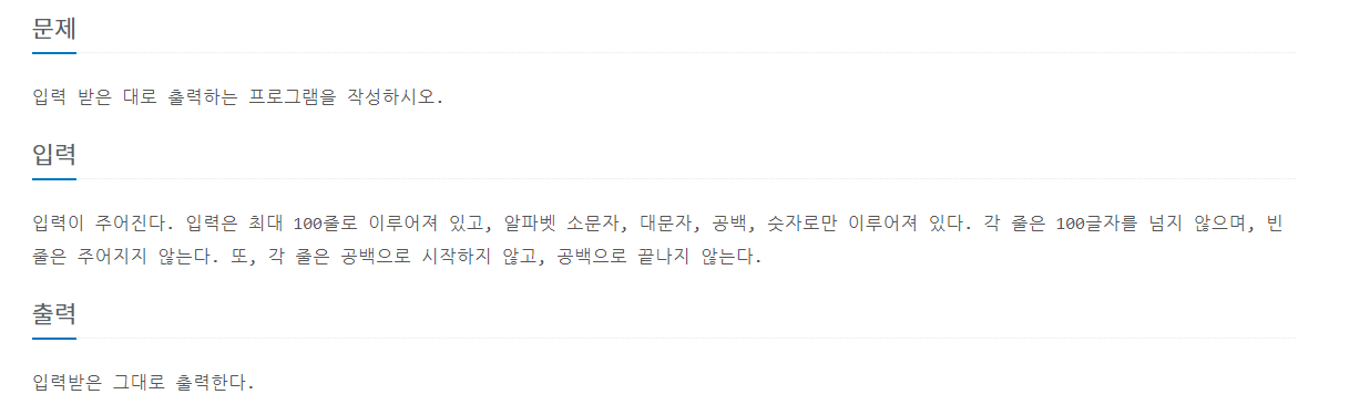 import java.io.BufferedReader; import java.io.IOException; import java.io.InputStreamReader; public class Main { public static void main(String[] args) throws IOException { BufferedReader buf = new BufferedReader(new InputStreamReader(System.in)); StringBuilder sb = new StringBuilder(); String str = ""; while((str = buf.readLine()) != null){ sb.append(str); sb.append("\n"); } System.out.println(sb); } }'PS > 백준' 카테고리의 다른 글