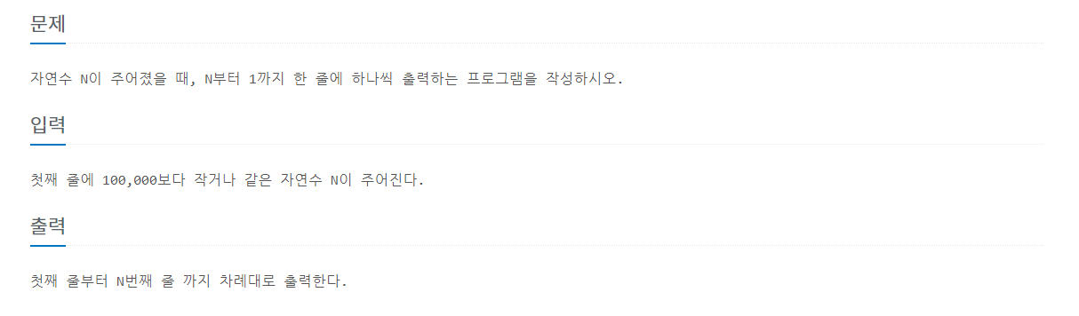 import java.io.BufferedReader; import java.io.IOException; import java.io.InputStreamReader; public class Main { public static void main(String[] args) throws IOException { BufferedReader buf = new BufferedReader(new InputStreamReader(System.in)); int loopLeng = Integer.parseInt(buf.readLine()); for (int i = loopLeng; 1 <= i; i--) { System.out.println(i); } } }'PS > 백준' 카테고리의 다른 글