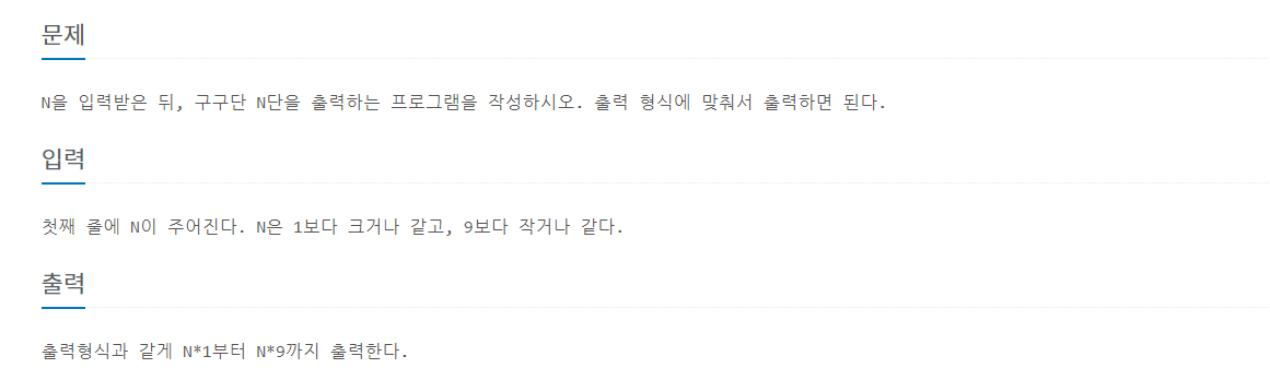 import java.io.BufferedReader; import java.io.IOException; import java.io.InputStreamReader; public class Main { public static void main(String[] args) throws IOException { BufferedReader buf = new BufferedReader(new InputStreamReader(System.in)); int num = Integer.parseInt(buf.readLine()); for (int i = 1; i <= 9; i++) { System.out.println(num + " * " + i + " = " + (num * i)); } } }'PS > 백준' 카테고리의 다른 글