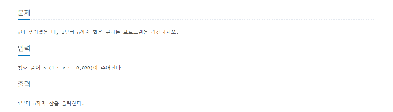 import java.io.BufferedReader; import java.io.IOException; import java.io.InputStreamReader; public class Main { public static void main(String[] args) throws IOException { BufferedReader buf = new BufferedReader(new InputStreamReader(System.in)); int loopLeng = Integer.parseInt(buf.readLine()); int total = 0; for (int i=1; i <= loopLeng; i++) { total += i; } System.out.println(total); } }'PS > 백준' 카테고리의 다른 글