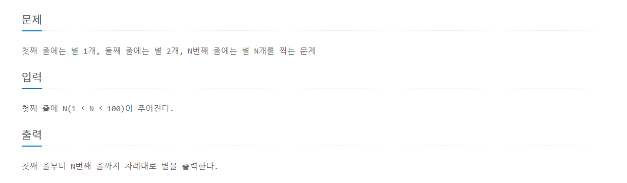 import java.io.BufferedReader; import java.io.IOException; import java.io.InputStreamReader; public class Main { public static void main(String[] args) throws IOException { BufferedReader buf = new BufferedReader(new InputStreamReader(System.in)); int loopLeng = Integer.parseInt(buf.readLine()); for (int i = 0; i < loopLeng; i++) { for (int j = 0; j <= i; j++) { System.out.print("*"); } System.out.println(""); } } }'PS > 백준' 카테고리의 다른 글
