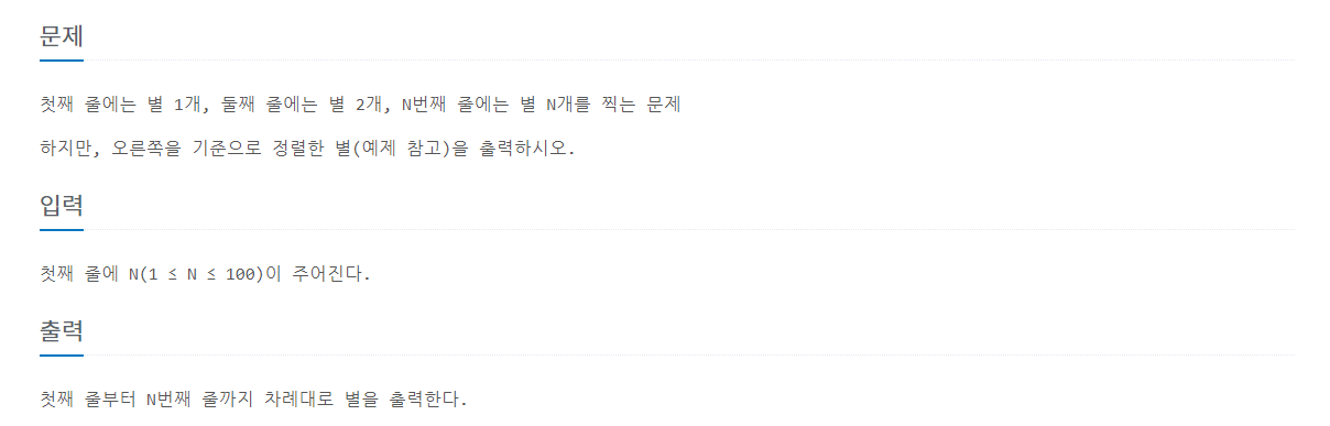 import java.io.BufferedReader; import java.io.IOException; import java.io.InputStreamReader; public class Main { public static void main(String[] args) throws IOException { BufferedReader buf = new BufferedReader(new InputStreamReader(System.in)); int loopLeng = Integer.parseInt(buf.readLine()); for (int i = 1; i <= loopLeng; i++) { for (int j = 1; j <= loopLeng-i; j++) { System.out.print(" "); } for (int k = 1; k <= i; k++) { System.out.print("*"); } System.out.println(""); } } }'PS > 백준' 카테고리의 다른 글