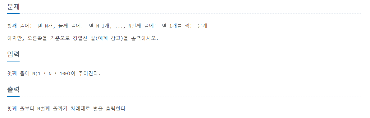 import java.io.BufferedReader; import java.io.IOException; import java.io.InputStreamReader; public class Main { public static void main(String[] args) throws IOException { BufferedReader buf = new BufferedReader(new InputStreamReader(System.in)); int loopLeng = Integer.parseInt(buf.readLine()); for (int i = 0; i < loopLeng; i++) { for (int j = 1; j <= i; j++) { System.out.print(" "); } for (int k = 0; k < loopLeng - i; k++) { System.out.print("*"); } System.out.println(""); } } }'PS > 백준' 카테고리의 다른 글